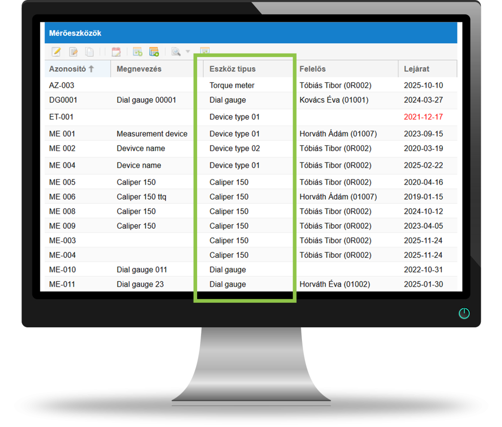 A típusok kategorizálják, szűrhetővé teszik az eszközeinket. Típusonként tudunk kimutatásokat, listákat lekérni és a felülvizsgálati tervet és az ezzel kapcsolatos feladatokat is megtekinteni.